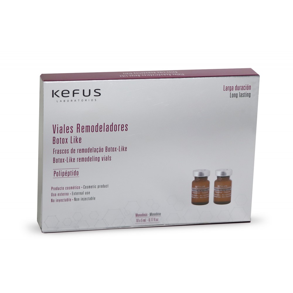 Viales Remodeladores Kefus con Polipéptidos de larga duración y efectos reversibles, reduciendo las arrugas superficiales y profundas. En 4 semanas los efectos son visibles. Minimiza las arrugas de expresión en frente, patas de gallo, comisura de los labios y arrugas naso-labiales.
